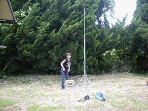 番組は福山市瀬戸町の観測所からの生中継です。電気も電話もないところなので、RCCラジオカーの藤原真歩さんがアンテナと、バッテリー駆動の送信機を設置しているところです。 |