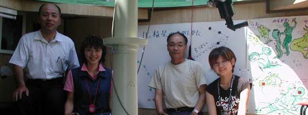 児玉さんの夢は塾生の中から宇宙飛行士を誕生させること。 番組は8月17日未明の木星食を紹介して終わりました。折戸さんはインタビュー中の 無防備なときに、強力な薮蚊にふくらはぎを襲撃され、大きな「ほろせ」ができました。 |
