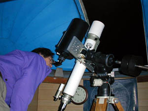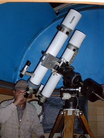 2つの10.2cmフローライト屈折望遠鏡を比較観 望の児玉さん。 |