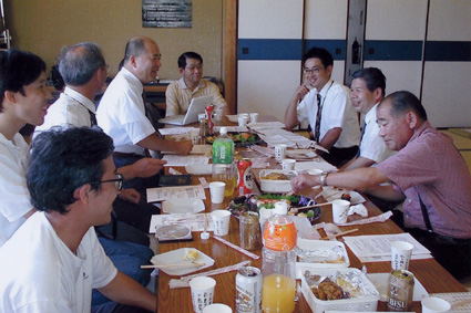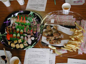| お寿司と、ビールは佐藤会長から皆さんに振る舞われ、からあげとポテトフライは金尾さんが持ち込んでくださいました | ||