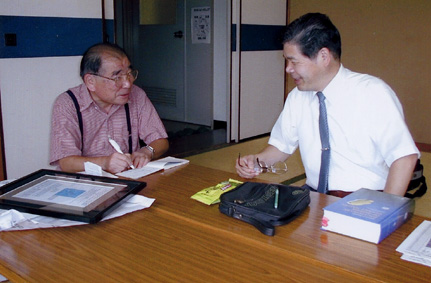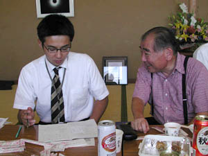 | NHKの次は、中国新聞社の取材がありました。佐藤健氏と打ち合わせ中です | ||