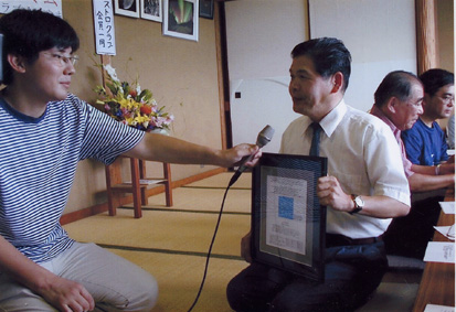| 佐藤健さんから小惑星の証明書を受け取る佐藤会長。 NHKテレビの取材で、桜を演出中のメンバー諸兄 | ||