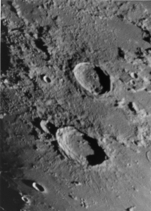 アリストテレスとエウドクソス 撮影データ:25cm反射、コダック、Tmax400,上がエウドクソス、クレーターで直径67Km、下がアリストテレスで直径87Kmあります。強拡大してあるのと、太陽高度が高いのでクレーター内部がよく見えています。
