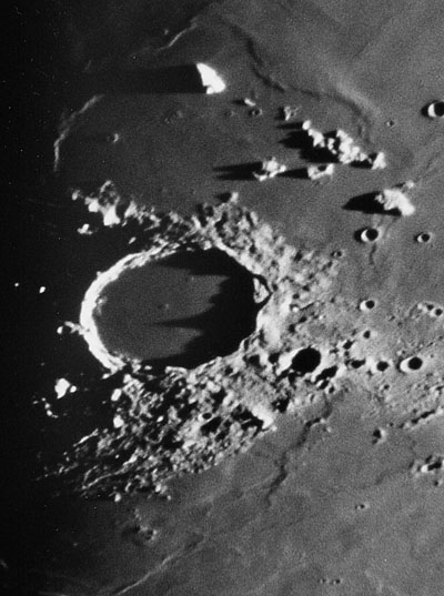 プラトーの小クレーター 撮影データ:25cm反射。フイルム=T−MAX400 プラトークレーターの強拡大です。クレーター内部の小クレーターは写すには中々大変です。欠け際ぎりぎりの月齢の時、たっぷり露出をかけないと写りません。