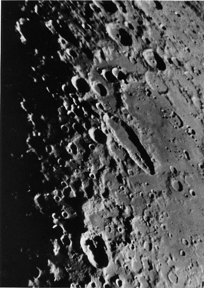 シラー付近 撮影データ:1985年10月8日(2/1秒)、20cm反射、PJ-11にて拡大トライX、マイクロドールX、1:2、13分 解 説 : 月面南西部にある珍しく細長いクレーターが見えるのがシラーで179Km×71Kmあります。二つのクレーターが重なりあってできたとも、言われている。クレーター内部北部に小山脈が走っています