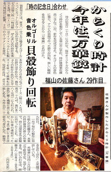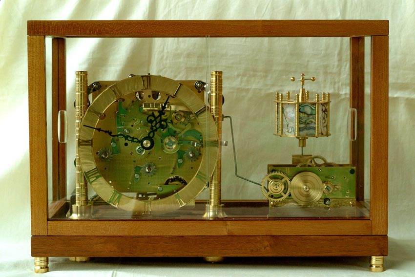 向かって右側の灯籠のように見える部分が15分毎にチャイムが鳴るときに 廻ります。綺麗に見えるのは薄くスライスした螺鈿(アワビ)を八面はめ込んで います。0.3mmの螺鈿材を一枚に付き四箇所溝をフライス盤で切ってはめ込んでいます。