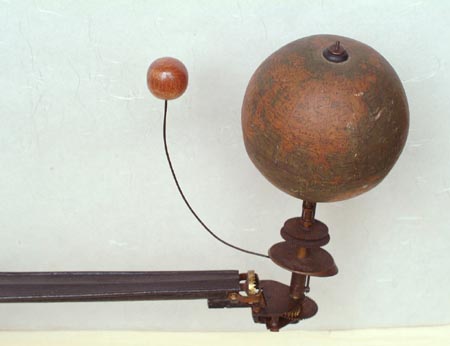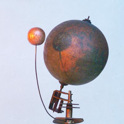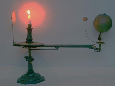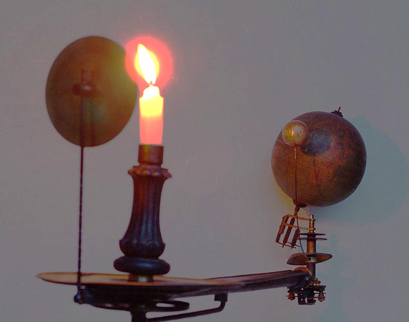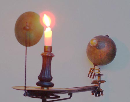 ![]() こうして完成させて、ろうそくの明かりを付けて テストしてみました。反射板が功を奏して月の陰がちょうど地球儀のアフリカあたりに落ちています。 |