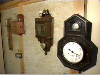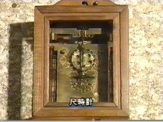 これが江戸時代に使われた尺時計というものですが、これを復元したんです。 菱形にあるのが 時間の文字盤で、上から下に針が降りるんです。24時間で一番下まで・・・はい 3作目に作ったんですけれども おじいさんが鐘を叩いてくれます。未だに人気が良いですね。 これは中の機械を見てもらおうと言うことで六角形にして文字盤が上にあり、上から見るようになっています。 これはピノキオというタイプで15分ごとにチャイムが鳴る毎にピノキオが釘を打つ仕草をするんです。 |