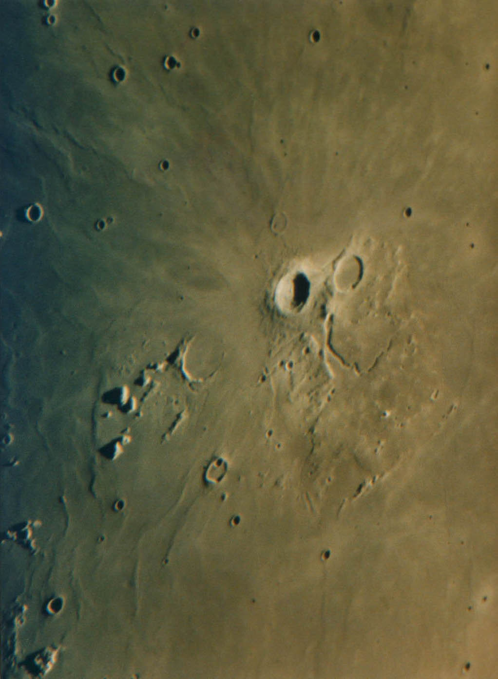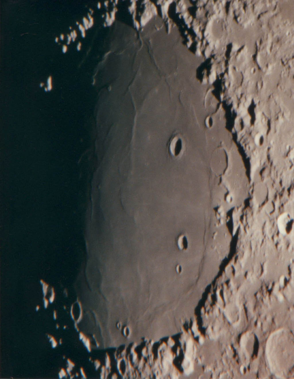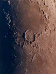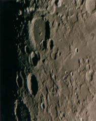 中央にある輝いているクレーターがアリスタルコスで内壁が非常に明るく、プリント時焼き込みも小クレーターなので難しいものです。アリスタリコスの右下にある谷がシュレーター谷で、蛇のような不気味な谷です。