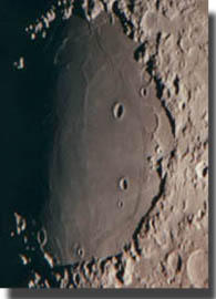 中央にある巨大クレーターがガッセンディ(直径110km)で、周囲のリムは低く、クレーター内には無数に割れ目があります。その上部にあるのが湿りの海で、小クレーターやしわがたくさんあるのが望遠鏡で見えます。