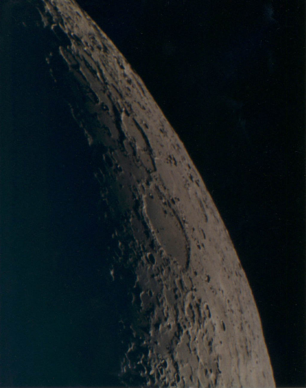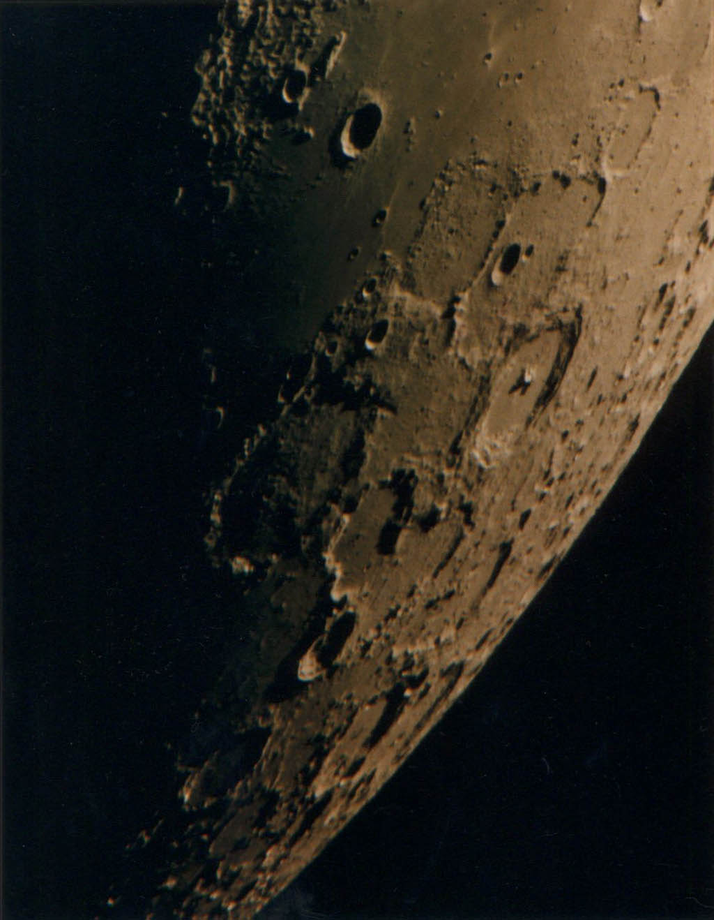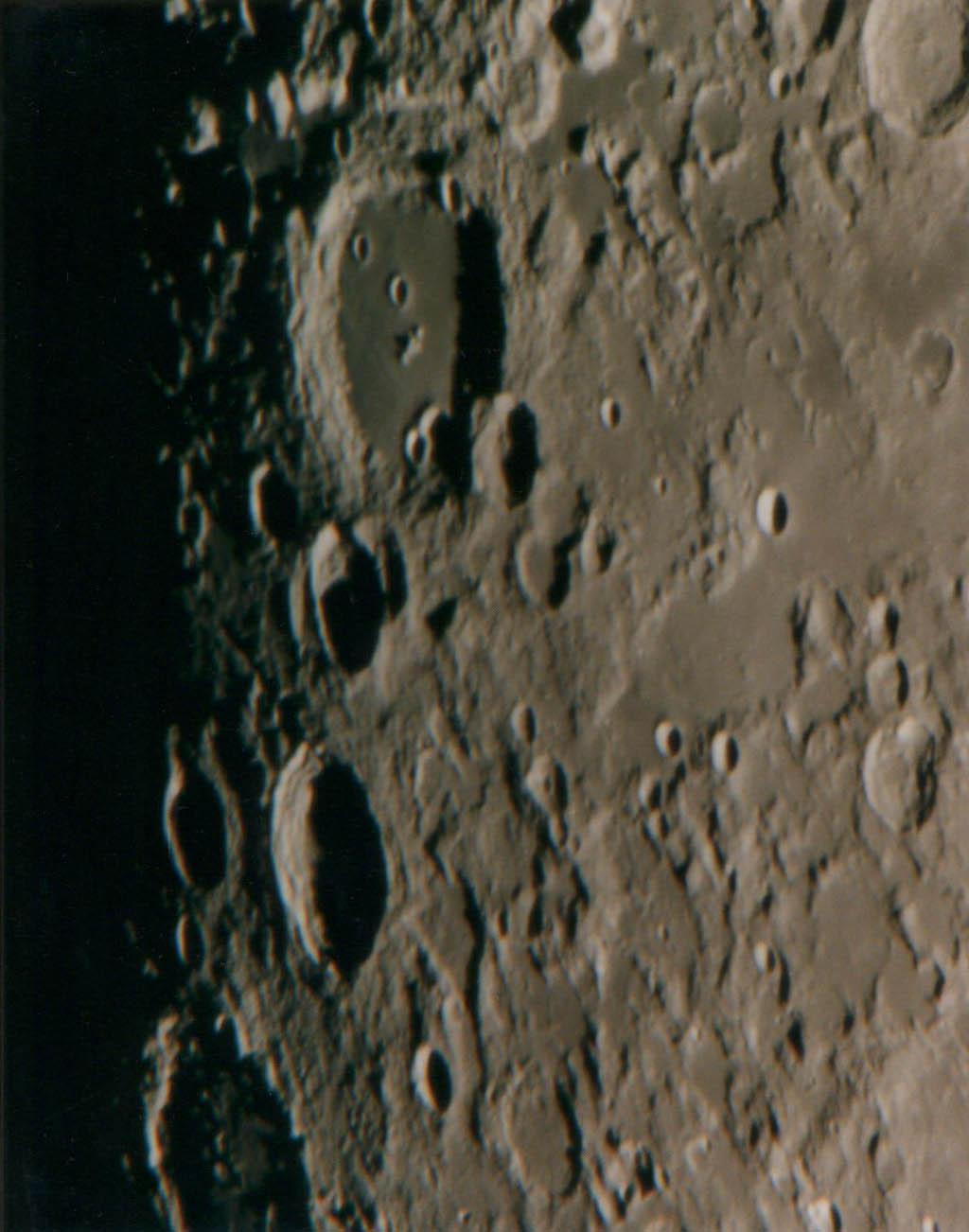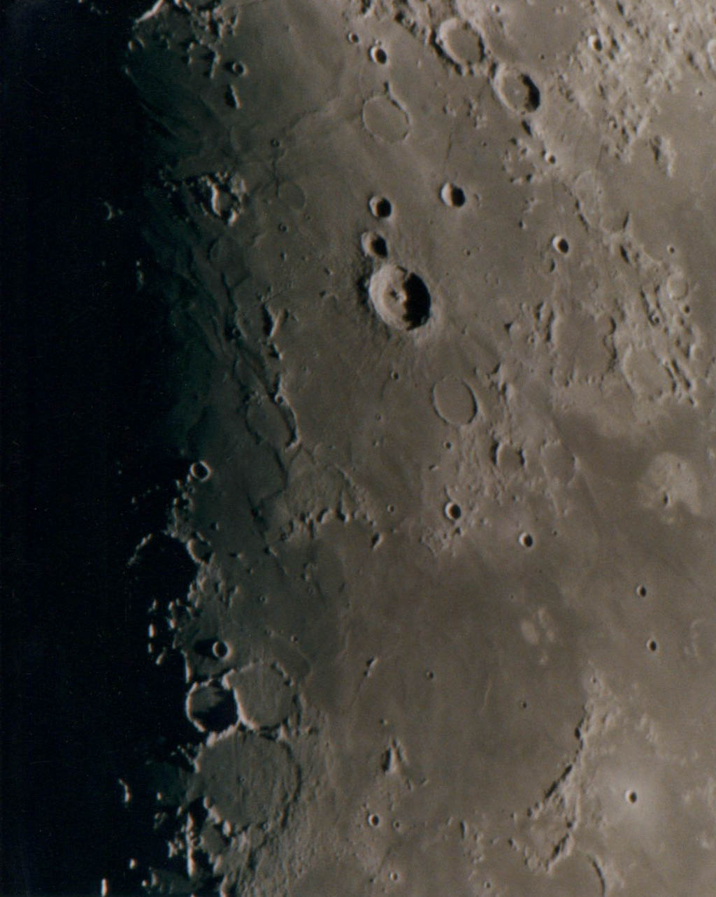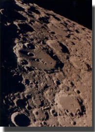 巨大クレーター、グラビウスが欠け際にある強拡大写真です。銀塩写真ではシーングの関係で普通なかなかここまで拡大できません。クレーター内には微小クレーターや山が多く見られます。