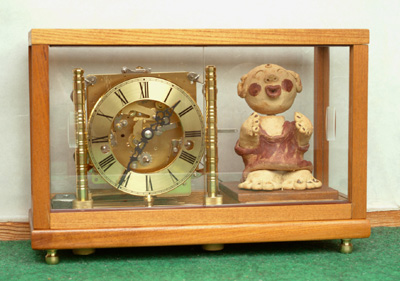 ムーブメントはスリーチャイム(3曲)付きのドイツ製です。カラクリを何を使用かと思案していたら趣味で陶器の創作をしている方が今、お地蔵さんが静かなブームだと言う事でカラクリにどうかと勧められ使う事にしました。