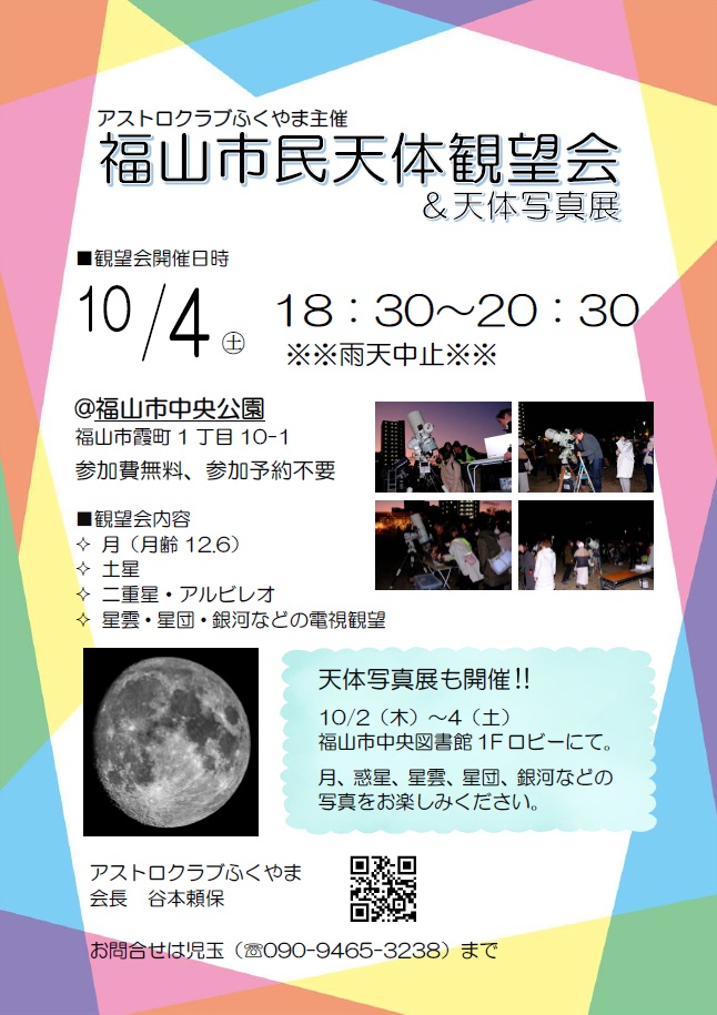 投稿日: 2025年8月23日2025年8月23日 投稿者: astro-ishizaka福山市民天体観望会のお知らせ(2025/10/4開催) 今年も福山市民の皆様に向けた観望会を行います。ぜひご参加ください。 関連 FacebookXBlueskyCopy
